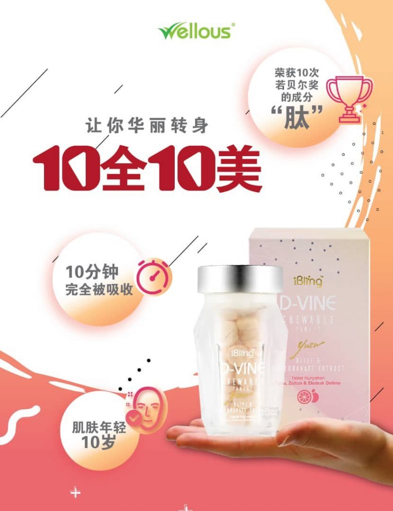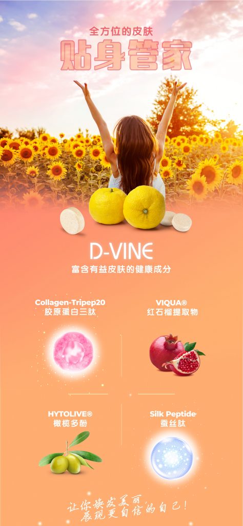 D-VINE胶原蛋白肽是美颜配方,添加了Collagen-Tripep 20胶原蛋白三肽、Viqua 红石榴提取物、Hytolive 橄榄多酚等,让皮肤润滑、美白、亮泽和健康。