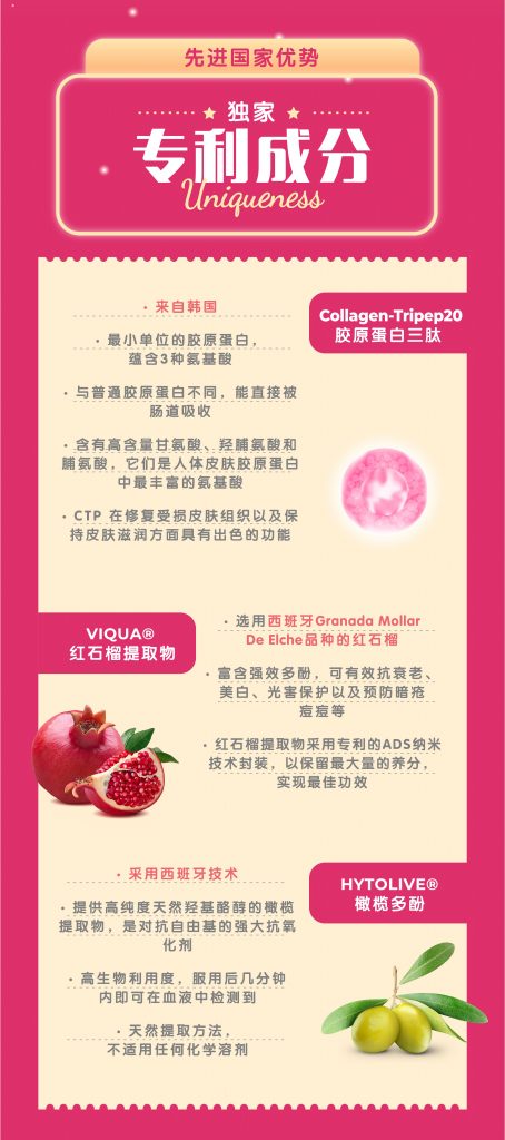 D-VINE胶原蛋白肽含有三种主要专利成分:来自韩国的Collagen-Tripep20 胶原蛋白三肽,来自西班牙的Viqua石榴萃取物和来自西班牙的Hytolive橄榄萃取物。