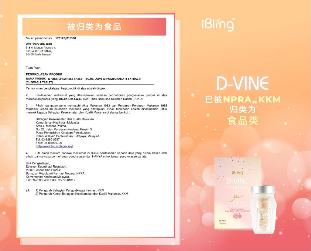 DVINE胶原蛋白肽已被NPRA,KKM (卫生局)归类为食品类。